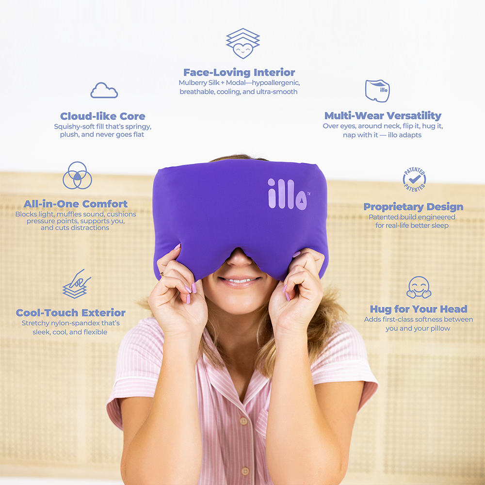 The revolutionary wearable pillow sleep mask designed for ultimate comfort during bed, naps, and travel, which can be worn on your head to effectively block out light and reduce sound. This multi-functional rest aid boosts a skin-loving interior crafted from a luxe blend of cooling, hypoallergenic mulberry silk and soft, breathable Modal, while the exterior is a stretchy, cooling nylon-spandex, making it perfect for all sleepers. More than just a simple eye mask, illo is a weighted, blackout-friendly accessory that provides contoured face support, positioning it as a superior and more compact alternative to typical airplane pillows, making it an ideal, thoughtful gift for anyone needing better, quality rest.
